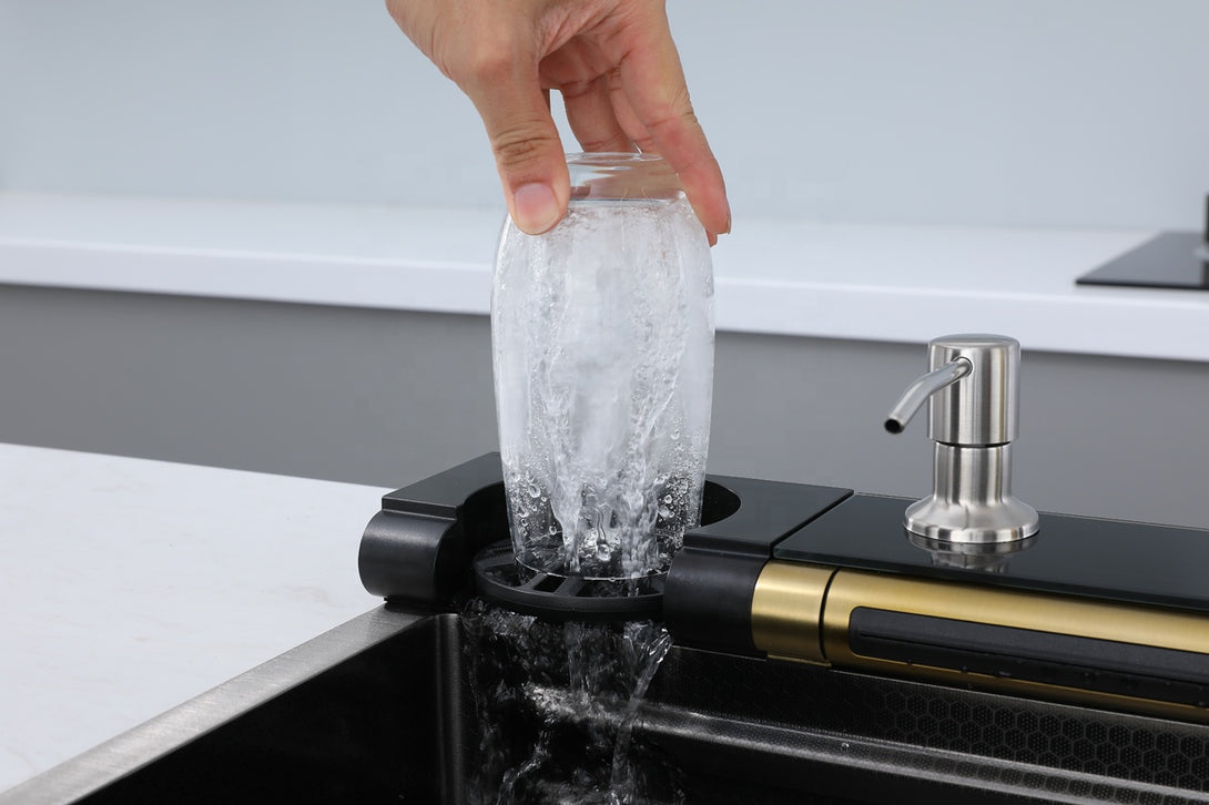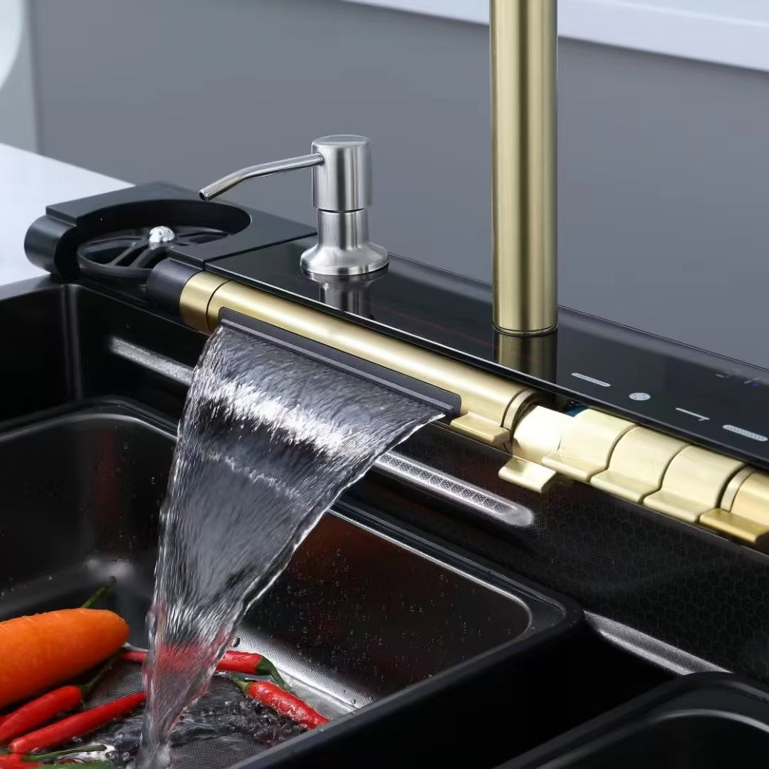 This multifunctional kitchen sink redefines what a modern sink can do. Designed for premium kitchens, it blends advanced technology with a sleek aesthetic, transforming your countertop into a complete workstation for food preparation and cleaning.