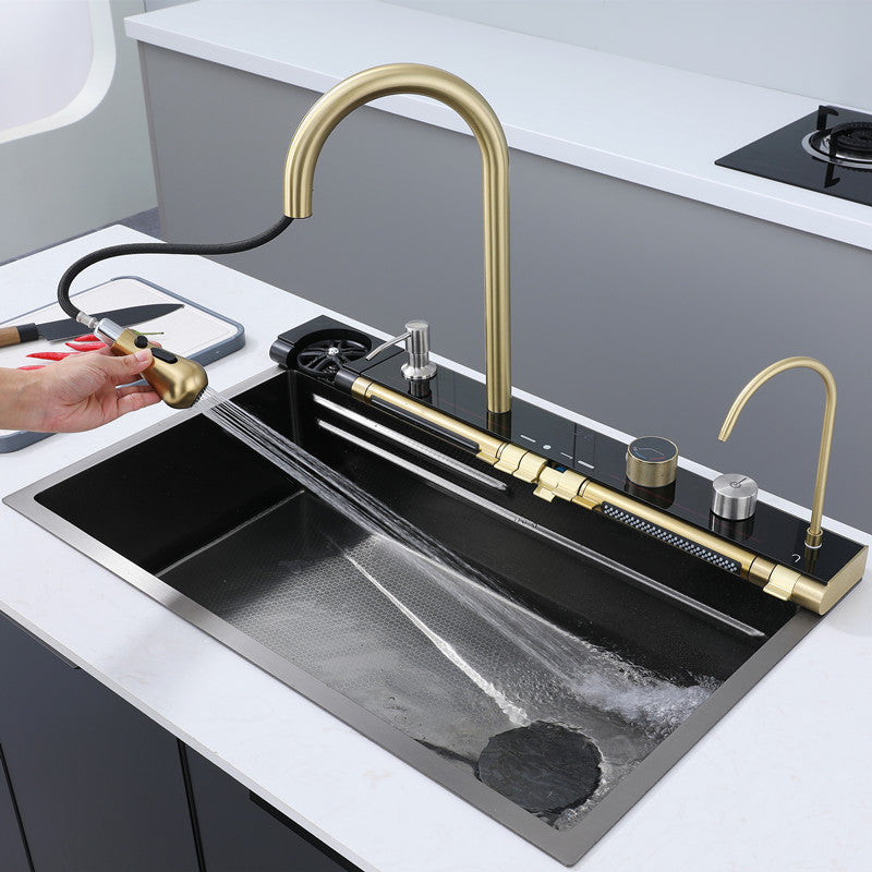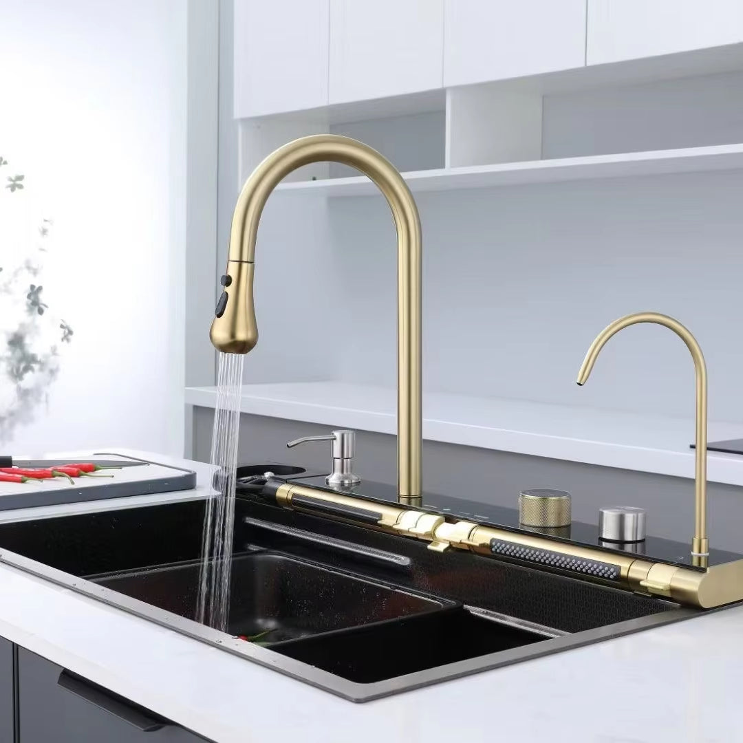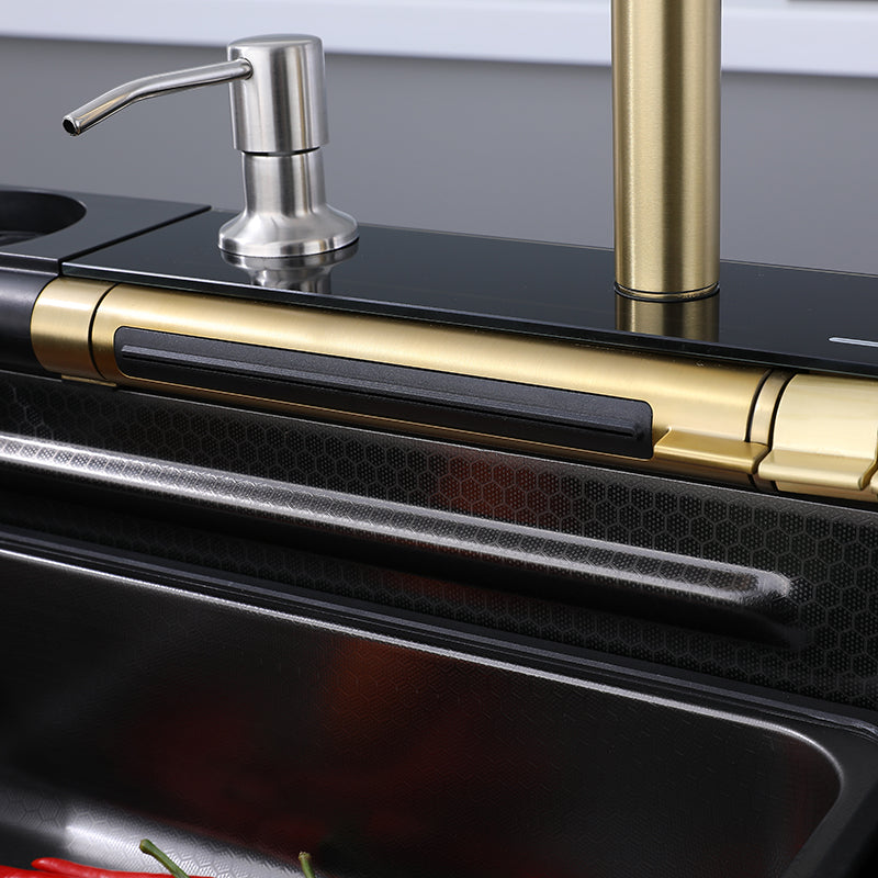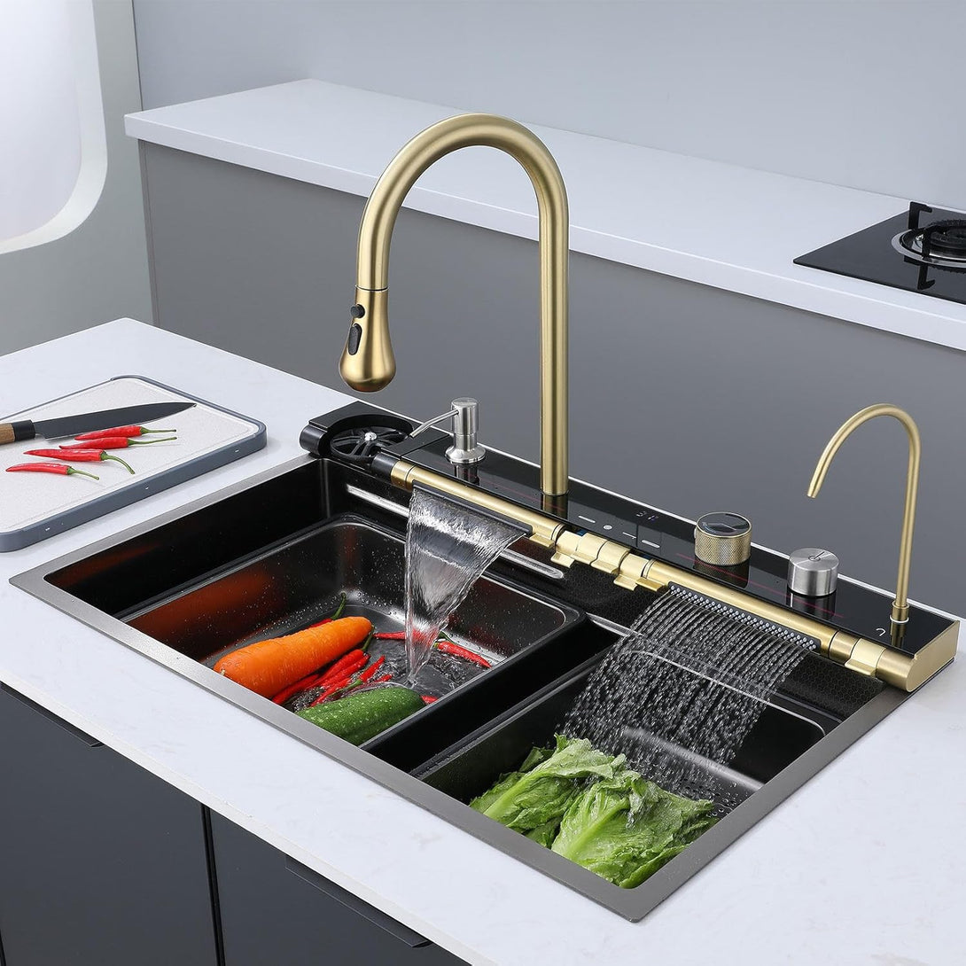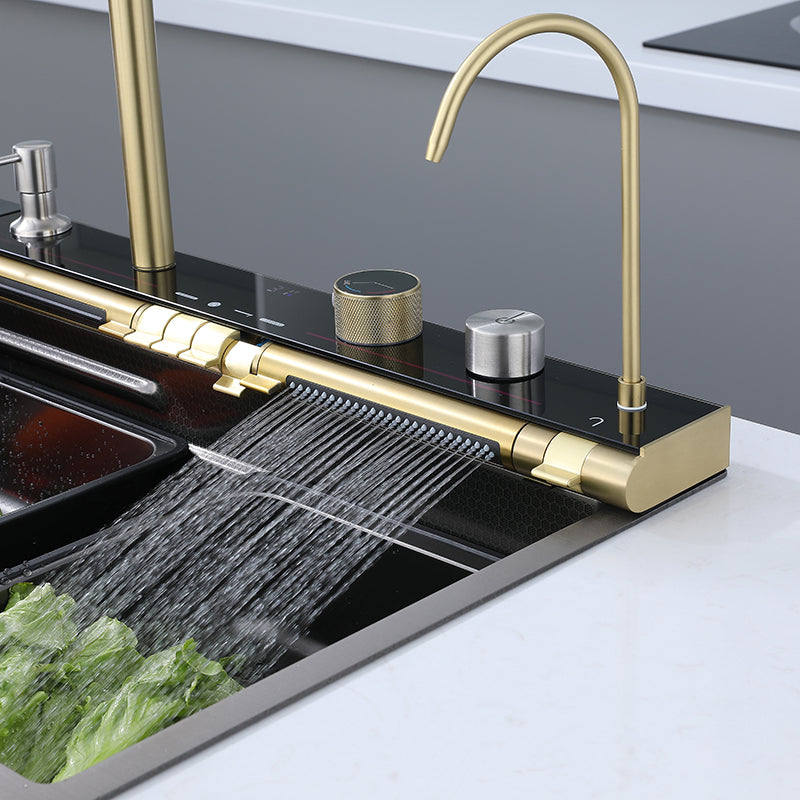 Multifunctional kitchen sink with 2 mobile waterfalls, 750 x 460 mm, LED display with black glass console, gold details, dark grey basin