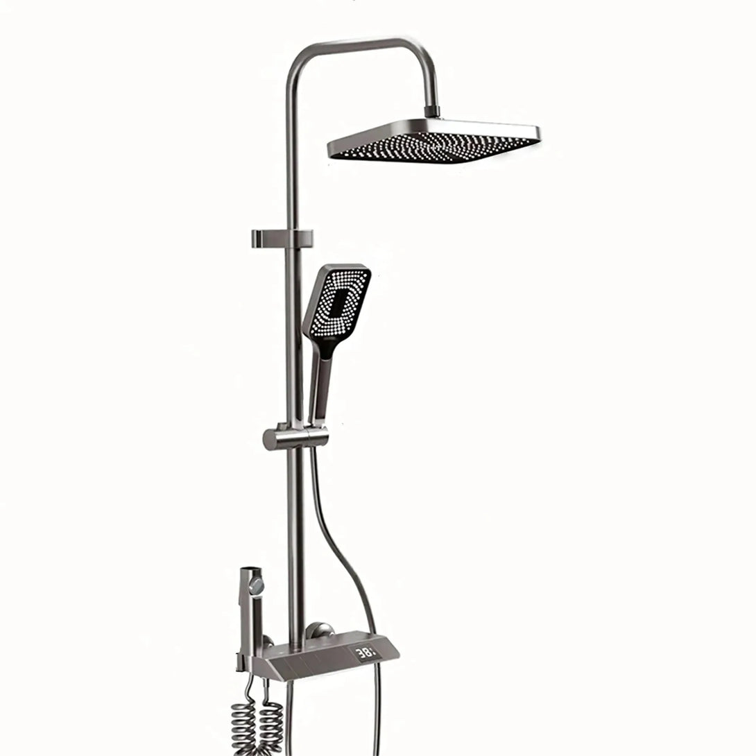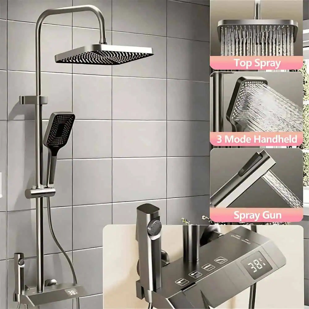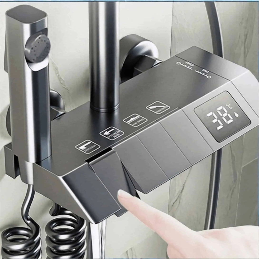 Transform your bathroom into a modern, high-performance wellness space with our Smart Digital Thermostatic Shower Column. Designed for walk-in showers and premium contemporary bathrooms, this system blends elegant aesthetics with advanced temperature control for a safe, relaxing, and luxurious daily experience. The tall installation height ensures an optimal rainfall effect, while the refined grey-brown finish and piano-style push controls elevate the look of any bathroom.
