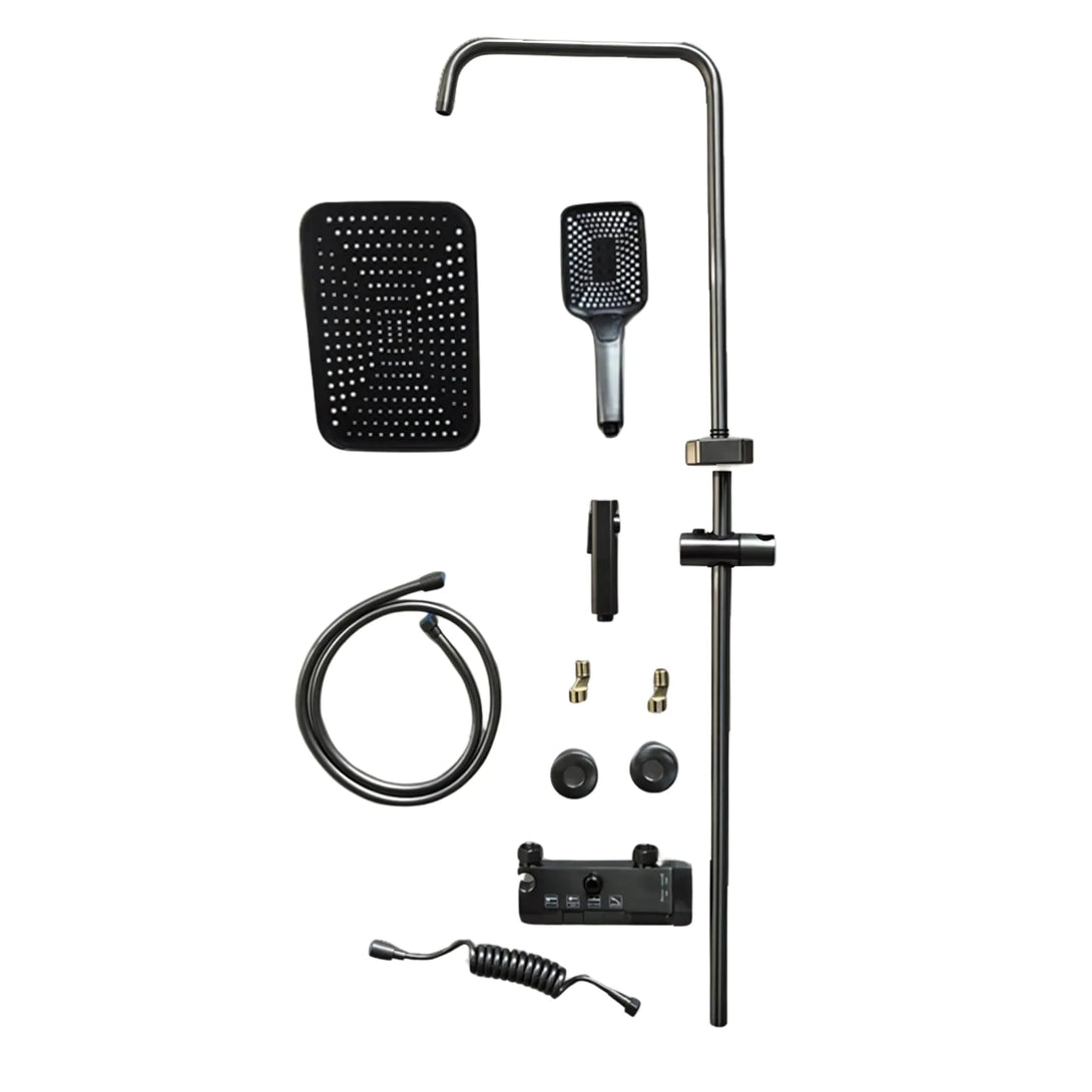 The integrated digital display shows the exact water temperature and works entirely without electricity — powered only by water flow. With a wide rectangular rainfall head and an ergonomic handheld shower, this system provides both comfort and practicality. The high-precision thermostat keeps water temperature constant, eliminating fluctuations and ensuring a smooth, enjoyable shower every time. Built from durable, corrosion-resistant brass, it’s made to last and maintain its premium appearance over time.